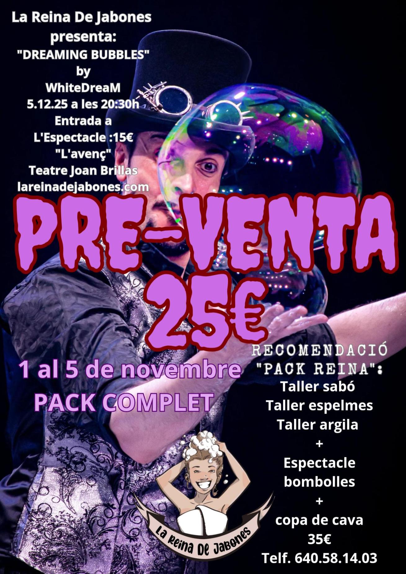 Tarda de tallers: farem taller de sabó de glicerina, taller d'espelmes de soja i taller d'argila polimèrica i després gaudirem del gran espectacle de bombolles de l'artista Whitedream.