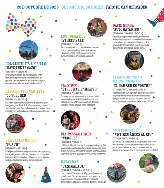 El Festival Internacional de Pallassos Memorial Charlie Rivel se celebrarà a la nostra ciutat del 18 al 25 d’octubre de 2026, però mentrestant i per fer més curta l’espera, el diumenge 26 d’octubre s’organitzarà una festa al parc de Can Mercader carregada d’actuacions de pallassos, totes gratuïtes i a l’aire lliure.