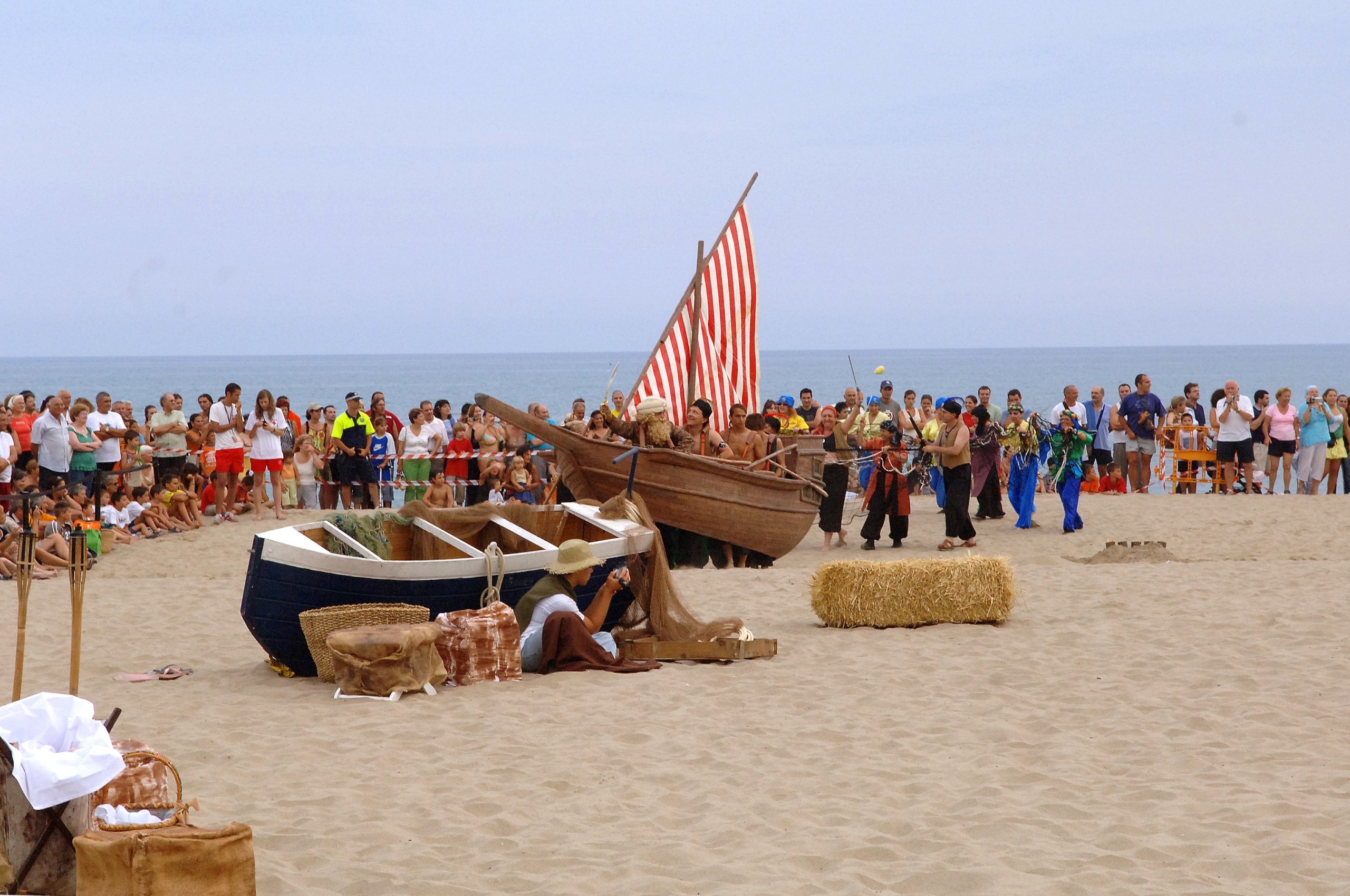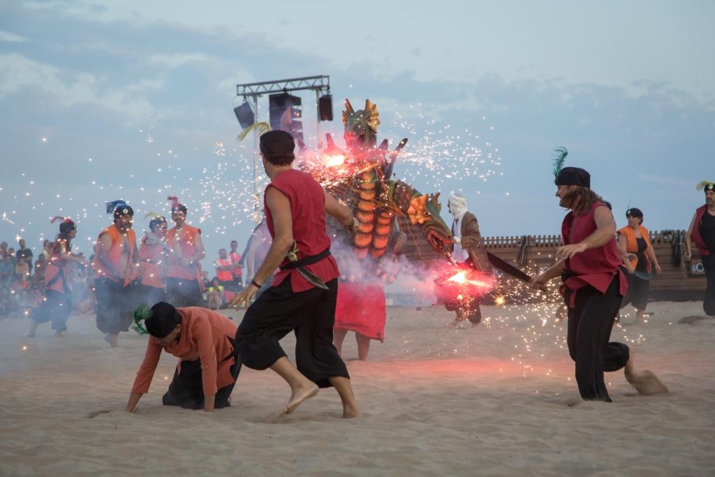 La representació es realitza a la platja acompanyada d'un muntatge escenogràfic amb la reproducció del castell, de dues galeres i del poble. En la representació hi participen 200 figurants i actors que sorgeixen de la col·laboració de les entitats culturals de la ciutat.