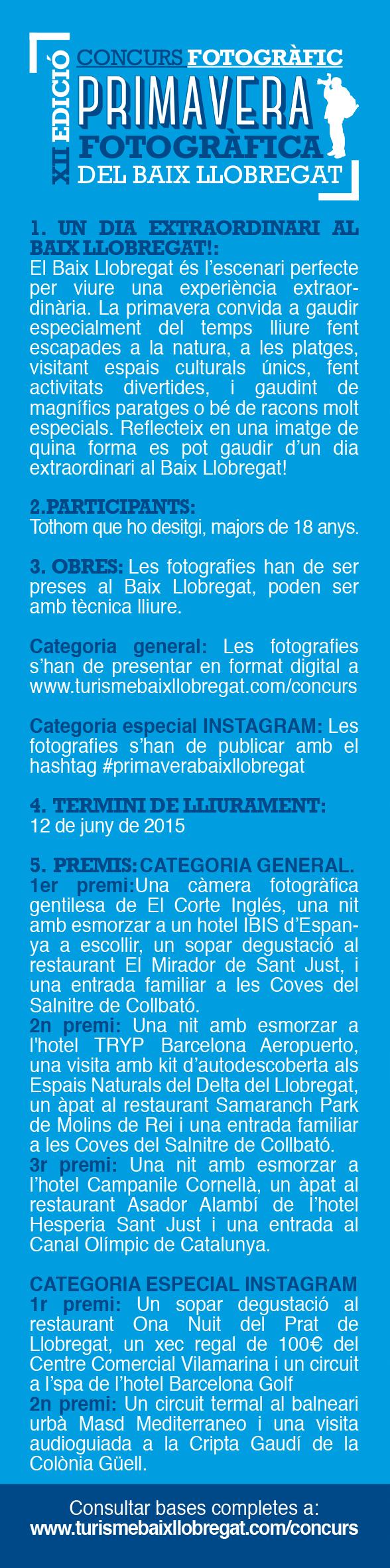 Les bases completes es poden consultar a www.turismebaixllobregat.com/concurs i al propi Consorci de Turisme del Baix Llobregat per telèfon al 93 685 24 00 ext. 552 o per email a  turisme@elbaixllobregat.cat.