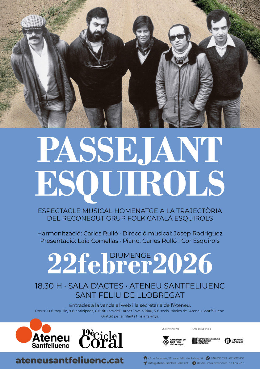 ’Passejant Esquirols’ és un homenatge a la trajectòria musical d’Els Esquirols, el grup nascut al cor del Collsacabra (Osona), a partir de 1969, en un moment de canvis històrics en què cantar en català era tot un repte. El grup -desaparegut el 1986- era format inicialment per Josep Casadesús, Joan Crosas, Joan Vilamala, Jaume Font, Rosa Maria Sadurní i Pep Molas. Posteriorment, s’hi van unir Dolors Roca, Rafael Sala i Ramon Estrada. El Cor Esquirols en aquest espectacle ens ofereix una proposta de les cançons d’Els Esquirols que tornaran a sonar amb força per ser compartides, un cop més, amb avis, pares i fills.